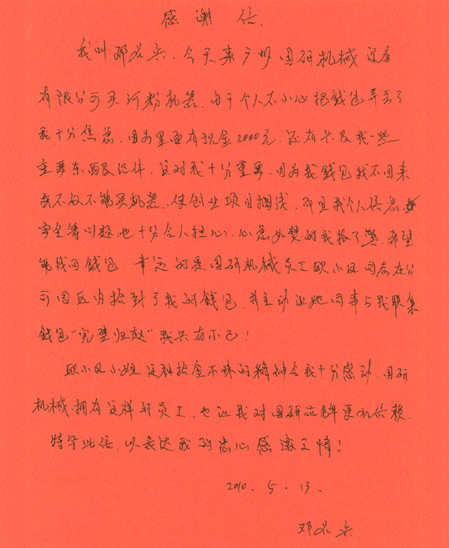 5月13日下午,一封署名為鄧名兵的感謝信送至公司領(lǐng)導(dǎo)手中,信中詳細描述了公司倉管員歐小鳳拾金不昧的感人事跡,請求公司對歐小鳳進行表揚,并感謝公司培養(yǎng)了歐小鳳這樣的好員工。