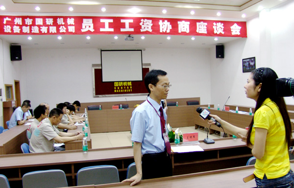 5月14日晚9:30分,中央電視臺(tái)新聞?lì)l道“新聞1+1’ 節(jié)目以《工人工資到底怎么才能漲?》為題重點(diǎn)披露富士康等企業(yè)在工人工資方面存在的種種問(wèn)題,同時(shí)正面報(bào)道了廣州國(guó)研機(jī)械通過(guò)建立員工工資集體協(xié)商機(jī)制解決員工工資問(wèn)題的先進(jìn)經(jīng)驗(yàn)。