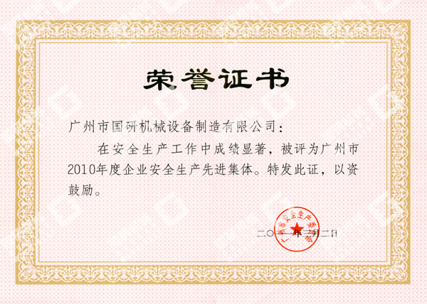 近日,在廣州市人民政府召開的安全生產工作總結暨表彰大會上再次傳來喜訊,廣州市國研機械設備制造有限公司被廣州市人民政府授予“廣州市2010年度企業(yè)安全生產先進集體”榮譽稱號。這是我司獲得中華全國總工會和國家安全生產監(jiān)督管理總局授予2009年度全國“安康杯”競賽優(yōu)勝企業(yè)稱號后,被授予的又一殊榮。