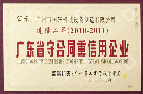 2012年3月,廣州市國研機械設(shè)備制造有限公司被評為2011年度“廣東省守合同重信用企業(yè)”。這是我司繼連續(xù)三年被評為“廣州市守合同重信用企業(yè)”之后,連續(xù)兩年獲此殊榮。